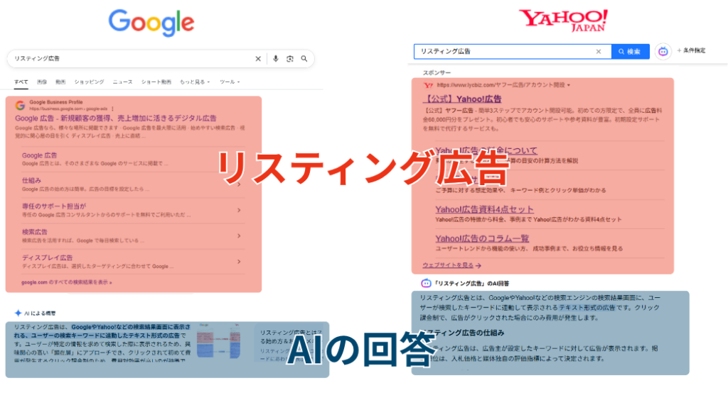 リスティング広告(listing advertising)とは、GoogleやYahoo!などの検索エンジンで、検索結果ページの上部や下部に「広告」「スポンサー」といった表記とともに表示される広告のことです。